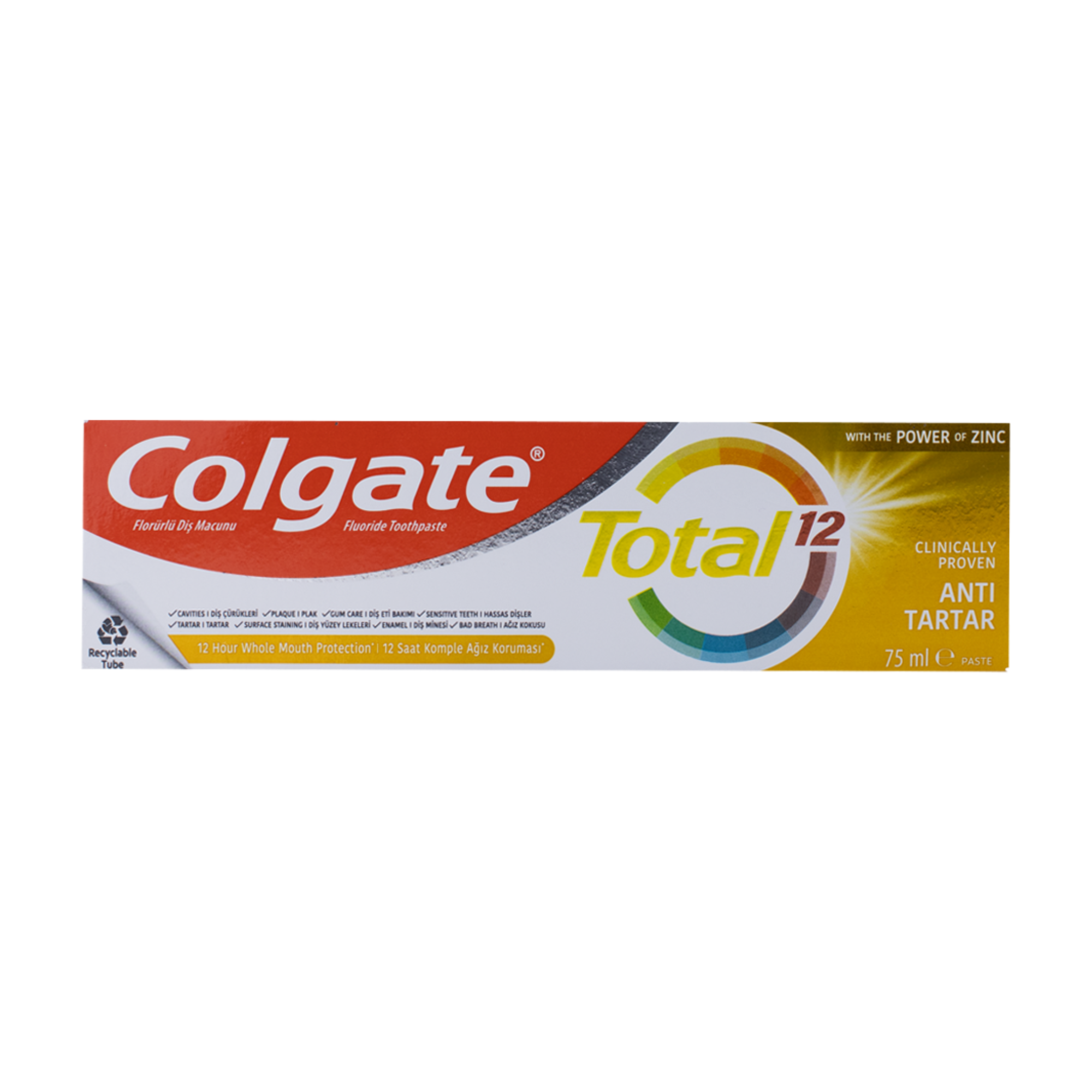معجون أسنان كولجيت توتال بياض متطور 75 مل هو معجون أسنان مصمم لتوفير حماية شاملة للفم والأسنان، مع التركيز على تبييض الأسنان. يوفر حماية ضد البكتيريا لمدة 12 ساعة، ويساعد في إزالة البقع السطحية لتحسين بياض الأسنان، بالإضافة إلى مقاومة التسوس والتهاب اللثة.