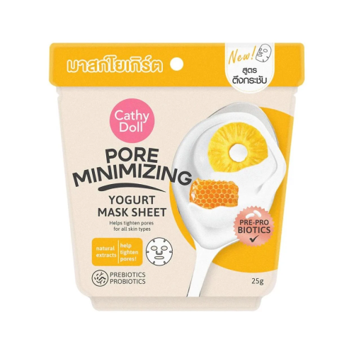 قناع الزبادي لتقليل المسام من كاثي دول هو قناع ورقي مصمم لتقليل حجم المسام وتنقية البشرة. يحتوي على مزيج من المكونات الطبيعية مثل مستخلص بندق الساحرة، فيتامين ب6، مستخلص الفطر، العسل، والبروبيوتيك، والتي تعمل معًا على شد المسام، وتنظيم إفراز الزيوت، وترطيب البشرة، وتنقيتها من الشوائب.