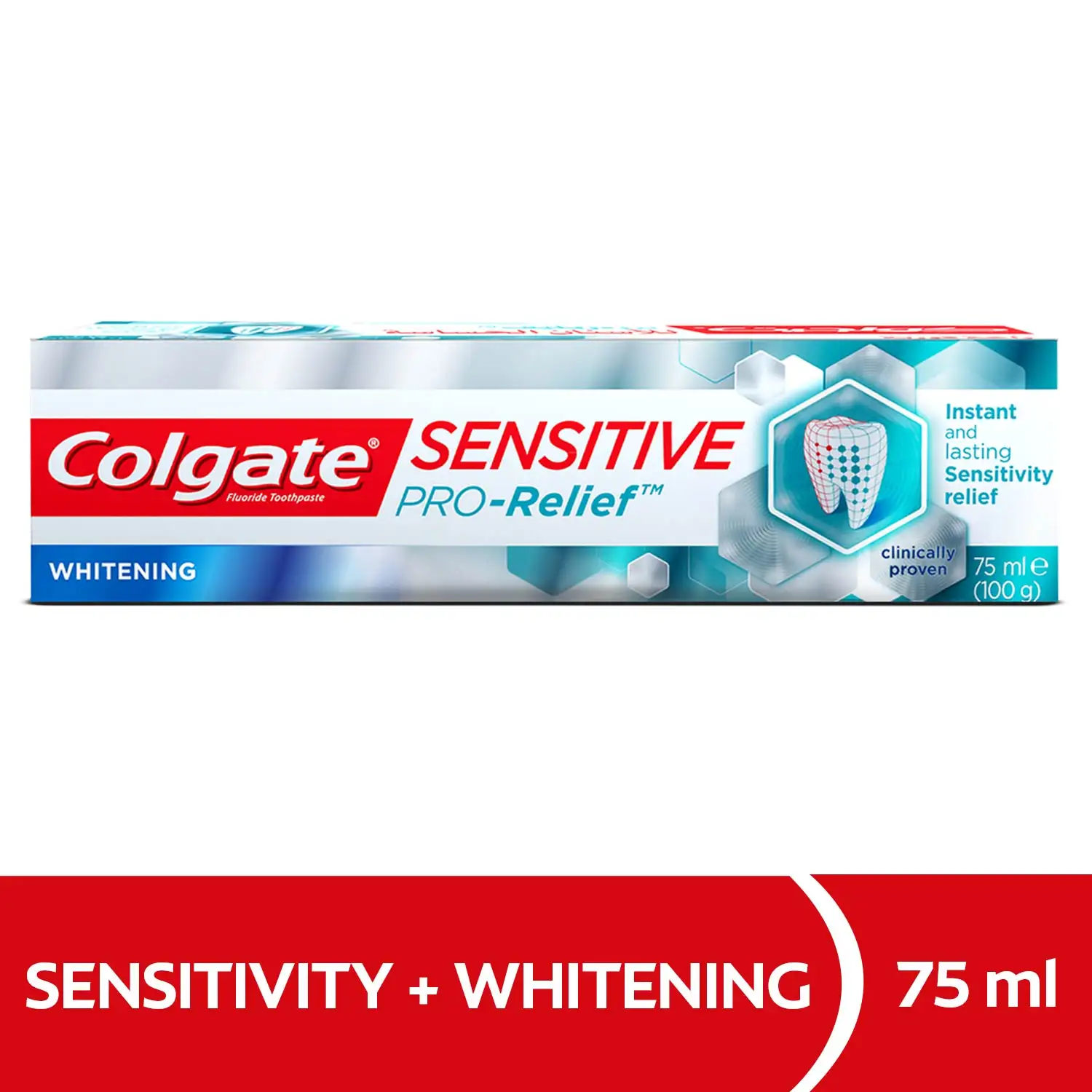 معجون اسنان كولجيت برو-ريليف للاسنان الحساسة يمنحك حرية نسيان كل ما يتعلق بالام الاسنان الحساسة. من اين تاتي الام الاسنان الحساسة؟ - انحسار اللثة وتاكل مينا الاسنان ممكن ان يؤدي الى كشف الاف القنوات الدقيقة والمؤدية لمركز اعصاب اسنانك. - عند ملامسة اسنانك للمواد الساخنة، الباردة او السكريات ينتقل الاحساس مباشرة من خلال القنوات الدقيقة الى الاعصاب ويتسبب في احداث الالم. كيف يعمل كولجيت برو-ريليف للاسنان الحساسة ؟ - معظم معاجين الاسنان الاخرى للاسنان الحساسة تعمل مبدئياً على تخدير الالم. - كولجيت برو-ريليف للاسنان الحساسة يعمل على سد القنوات الدقيقة التي تؤدي الى اعصاب الاسنان الحساسة وذلك ليساعد على ايقاف الالم. - مع الاستعمال المنتظم، يبني حاجزاً للحماية يدوم طويلاً و يعمل كغطاء واقي ضد حساسية الاسنان.