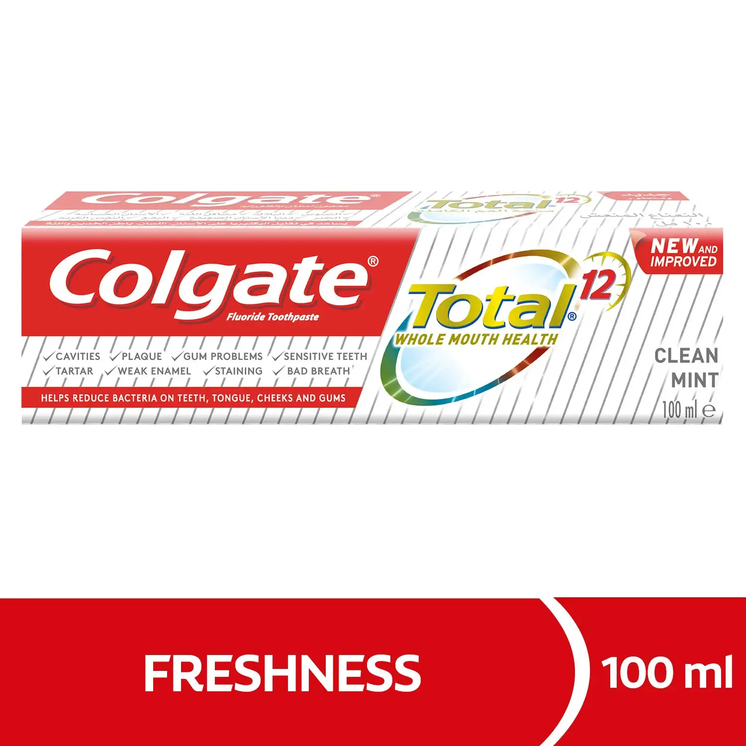 للحصول على فم صحي، الفرد يجب ان يعتني باكثر من مجرد الاسنان (يجب العناية باكثر من مجرد اسنان). لهذا السبب يحارب مسبقاً معجون الاسنان الجديد كولجيت توتال كلين منت البكتيريا ليس فقط على اسنانك، و لكن ايضاً على لسانك، باطن الخدين و اللثة لمدة 12 ساعة* لصحة الفم الكاملة. تمتع بالاختلاف الفريد لفم اكثر صحة مع افضل معجون اسنان لدينا لك و لاسرتك (لعائلتك). انه افضل معجون اسنان تنتجه كولجيت لصحة فمك بالكامل.