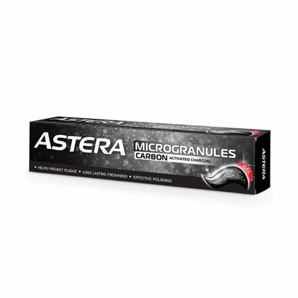 أستيرا معجون اسنان الحبيبات الدقيقة بالكربون يساعد الفحم المنشط على تبييض الأسنان وإزالة الاصفرار بشكل آمن، يعمل على إزالة البلاك والتصبغات من على سطح الأسنان، يحمي الأسنان من التسوس، يهدئ تهيج والتهابات اللثة، يمنح الفم رائحة منعشة تدوم طويلاً.