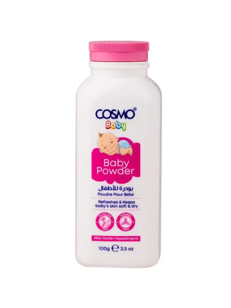 هل تبحثين عن أفضل رعاية لبشرة طفلكِ الرقيقة؟ بودرة أطفال من كوزمو: هذه البودرة الناعمة والخالية من العطور مصممة خصيصًا لحماية بشرة طفلكِ الحساسة من الحكّ والطفح الجلدي، وتتركها ناعمة ومنتعشة طوال اليوم. ناعمة على البشرة: تتميز بودرة كوزمو بنعومتها