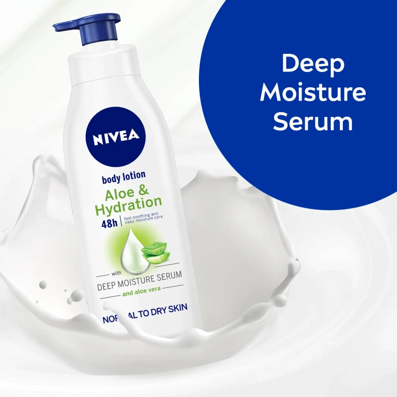 يحتوي على تركيبة خفيفة وسريعة الامتصاص تحتوي على مكونات نشطة مثل مستخلص الصبار وزيت اللوز الحلو لترطيب البشرة بشكل عميق وتغذيتها بالفيتامينات والعناصر الغذائية الضرورية للحفاظ على بشرة صحية وناعمة، ولوشن للجسم نيفيا يهدئ البشرة ويساعد في تهدئة التهيج والاحمرار.
