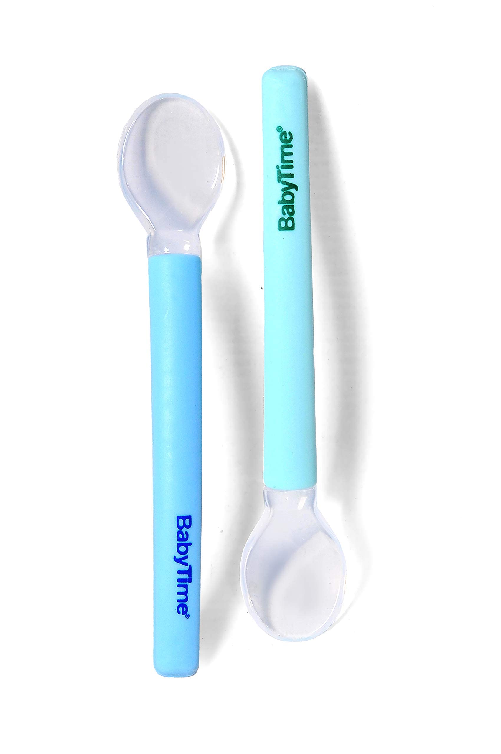 ملعقتي طعام "بيبي تايم" مصنوعتان من السيليكون، وتأتيان في مجموعة من قطعتين. اللونان المتاحان عادة هما الأزرق والأزرق الفاتح أو الوردي والبرتقالي الفاتح