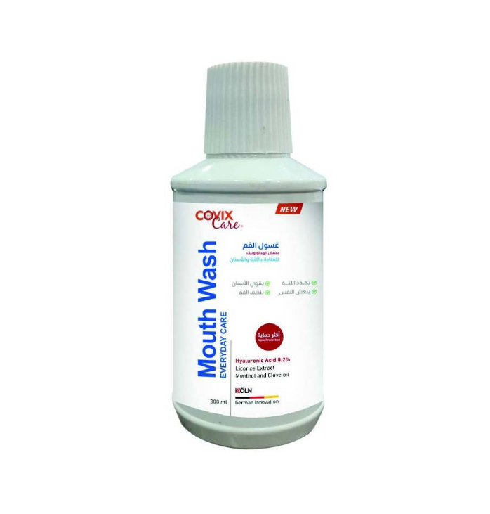 كوفيكس كير غسول الفم بحمض الهالورونيك للعناية بالاسنان و اللثة يخفف رائحة الفم الكريهة و جفاف الفم من خلال تركيبة مطورة من المستخلصات و المرطبات