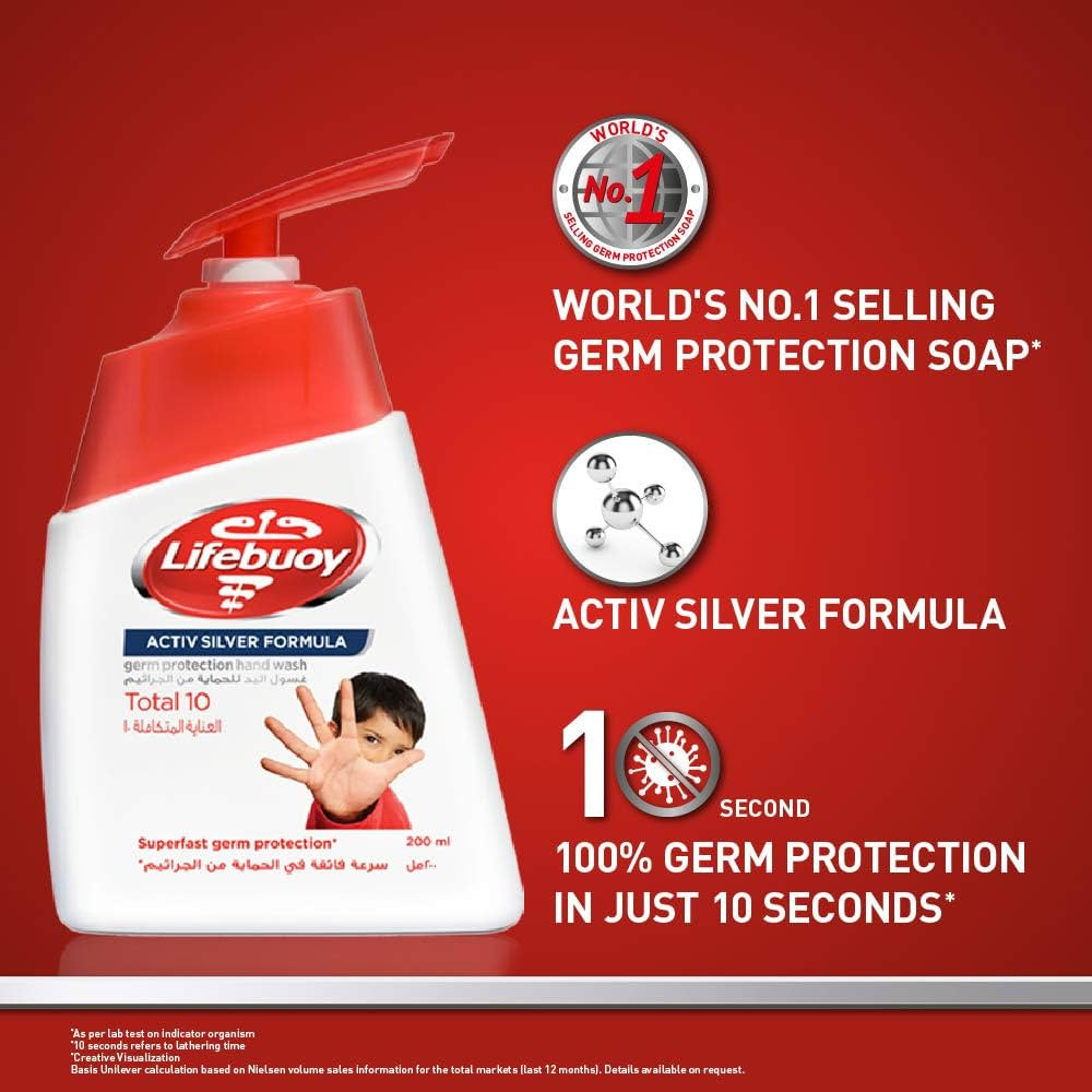 غسل اليدين خلال خمسة اوقات اساسية في اليوم (بعد دخول المرحاض، قبل تناول الفطور، والغداء، والعشاء، واثناء الاستحمام) بغسول اليد المتكامل 10 من لايفبوي سيحمي اطفالك من الجراثيم والامراض، وستفوح يديهم برائحة مذهلة.
