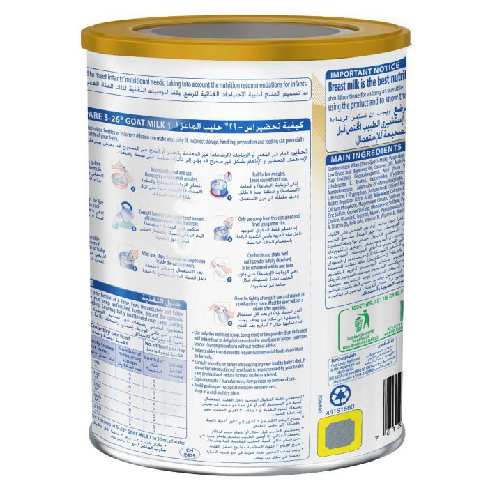 اس-26® حليب الماعز 1، من الولادة حتى 6 أشهر، تركيبة للرضع تعتمد على حليب الماعز، وهو منتج يتم إنتاجه في سويسرا. تتضمن إرشادات حليب اطفال ماعز اس 26 رقم 1 إرشادات هامة لضمان سلامة الرضيع وهي كالاَتي : اغلي الماء وتعقيم الزجاجات والأدوات. غسل اليدين والزجاجات واستخدام المكيال المرفق.