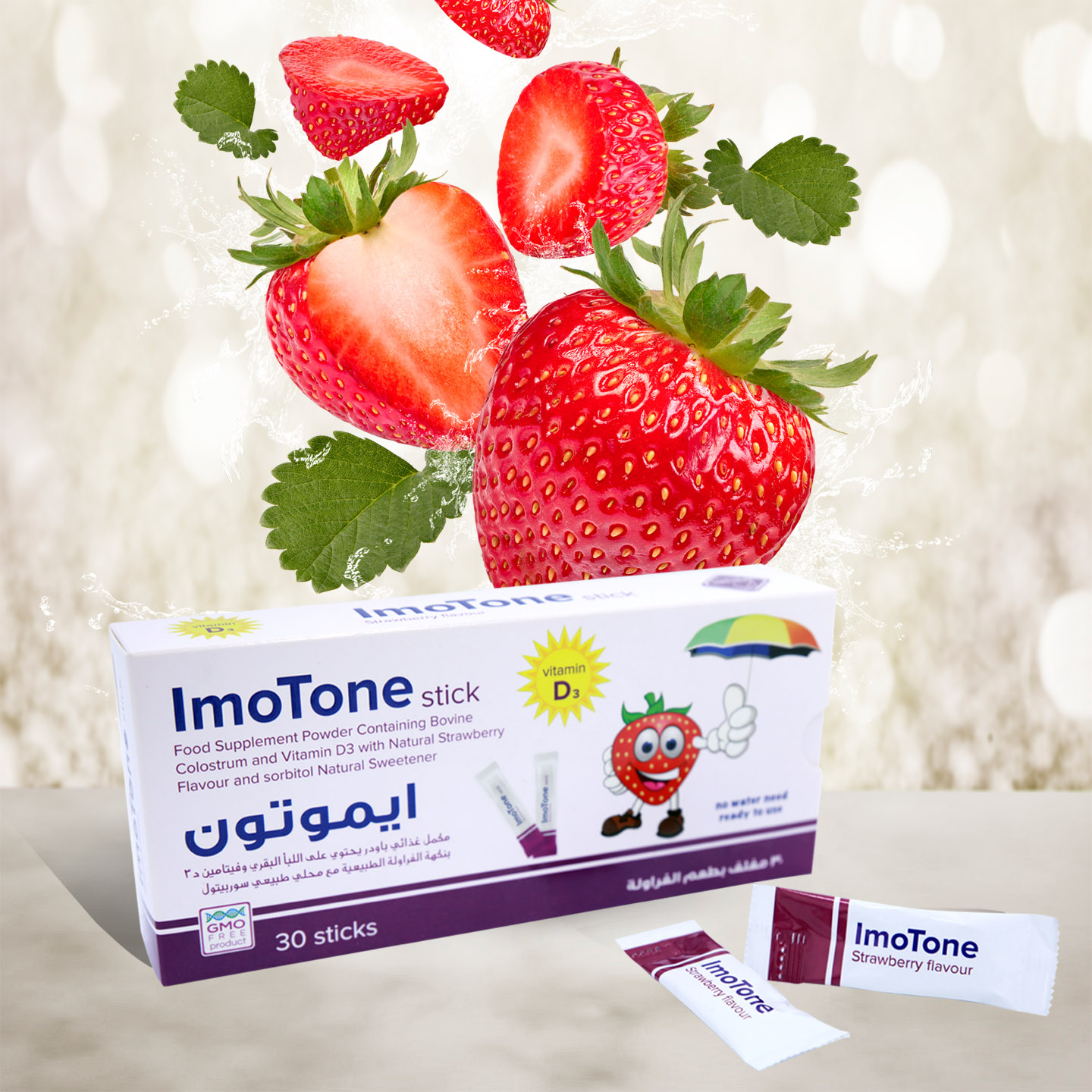 بودر 30 مغلف بطعم الفراولة. مكمل غذائي للأطفال يحتوي على اللبأ البقري وفيتامين د 3. يمنح الجسم مضادات حماية طبيعية لمقاومة الجراثيم والفيروسات ويعزز مناعة الطفل ويقويه. يستخدم كيس يوميا.