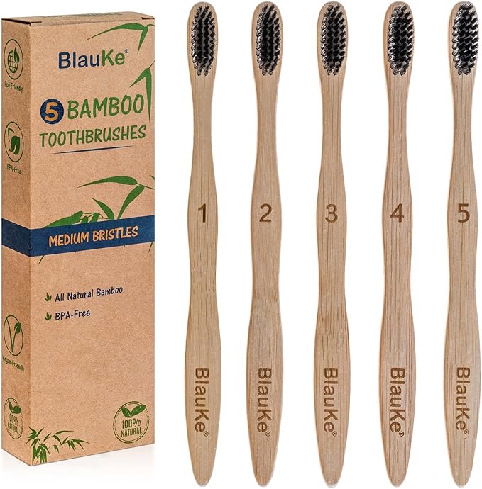 فرش أسنان طبيعية وصديقة للبيئة: إن فرش الأسنان المصنوعة من الخيزران الخاصة بنا عضوية وخالية من مادة بي بي ايه وغير سامة وتناسب للنباتيين. صُنعت الشعيرات المتوسطة من النايلون عالي الجودة الخالي من مادة بي بي ايه. العبوات معاد تدويرها وقابلة للتحلل وخالية من البلاستيك (عبوات خالية من النفايات).