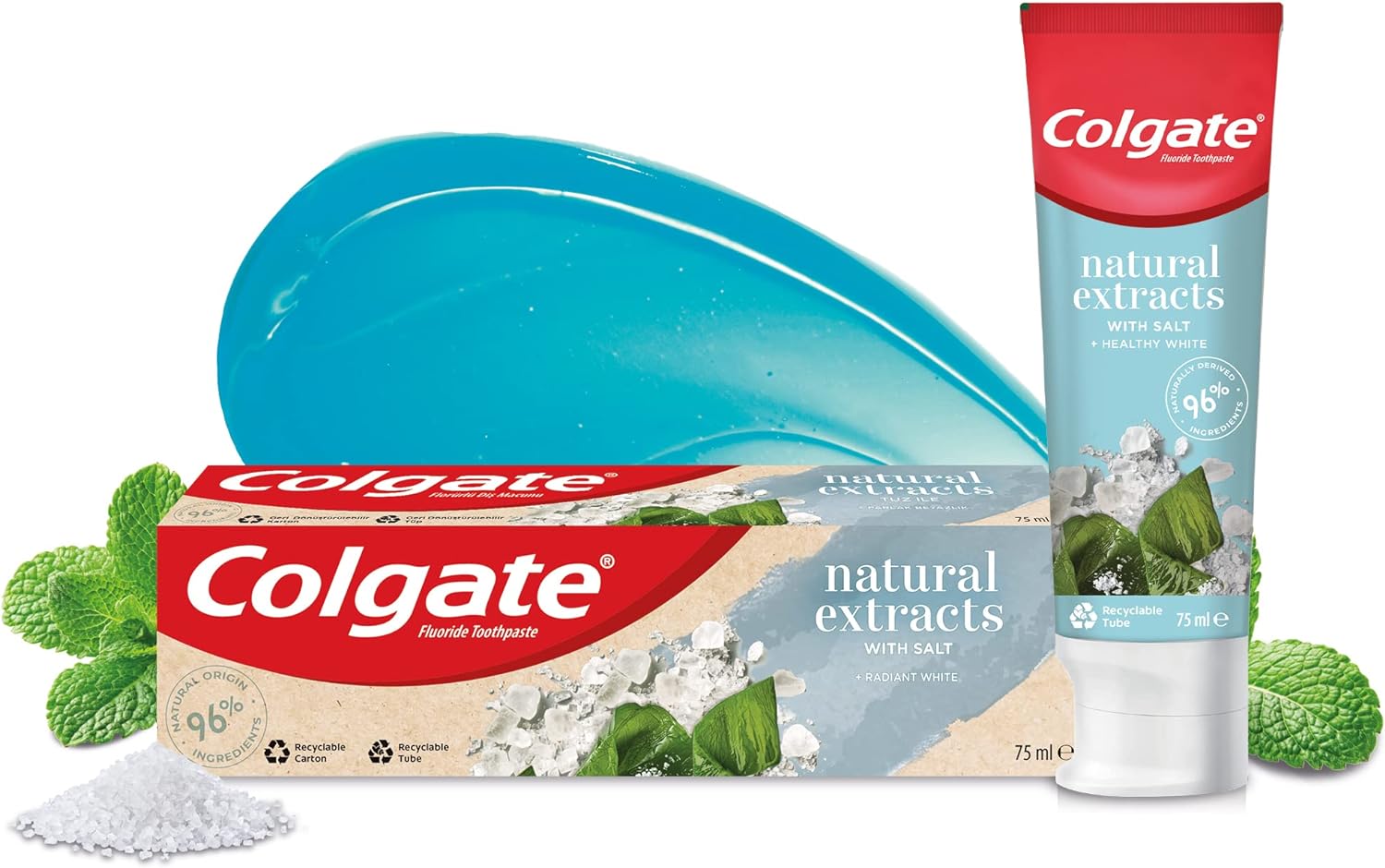 معجون أسنان كولجيت ناتشورال اكستراكت رادينت وايت الجديد بالأعشاب البحرية والملح لتجربة منقية وبنكهة المحيط المنعشة لبدء يوم جميل، استخدم منتجًا طبيعيًا على أسنانك.