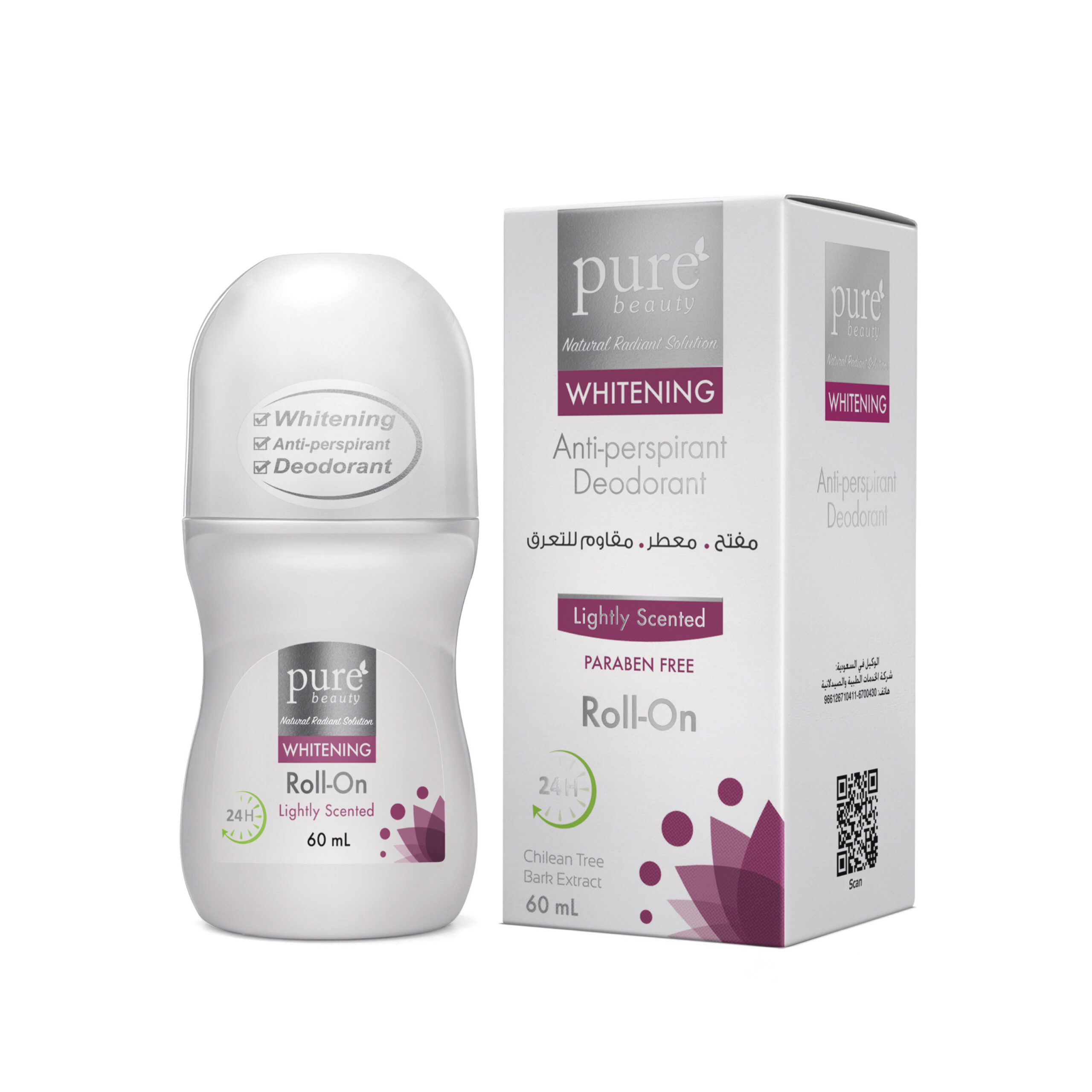 بيور بيوتي رول-أن عطر خفيف المفتح – مزيل عرق معطر، 60 مل يعمل على إضاءة منطقة الإبط. خلاصة شجرة التشيلي الموجودة داخله تعمل بشكل طبيعي وفعال على أيقاف أي تلون مستقبلي. يؤمن الحماية الكاملة طوال اليوم من التعرق. مناسب للبشرة الحساسة. متوفر بتشكيلة من العطور المميزة. إرشادات الاستخدام: ضعي طبقة الكريم يوميا في منطقة الأبط لمنع التعرق والمحافظة على بشرة بيضاء دائمة الإشراق. مناسب للبشرة الحساسة. التحذيرات والاحتياطات: للإستعمال الخارجي فقط. المكونات: Aqua,Aluminum Zirconium Tetrachlorohydrex Gly.,Cyclopentasiloxane,Steareth-2,Steareth-21,C12-15 Alkyl Benzoate,Diacetyl Boldine,Parfume (Fragrance),Caprylic/Capric Triglyceride,Iodopropynyl Butylcarbamate الحجم: 60 مل