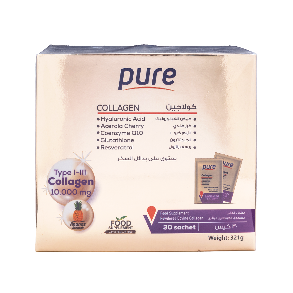 مكمل كولاجين مصمم لتعزيز مرونة البشرة وتماسكها وترطيبها. يحتوي على أنواع الكولاجين 1 و3 الممتازة، الضرورية لشباب البشرة والحيوية العامة. مدعّم بـ CoQ10 لدعم صحة خلايا البشرة وتقليل علامات التقدم في السن. يحتوي على الجلوتاثيون لتفتيح لون البشرة وإضفاء إشراقة صحية.
