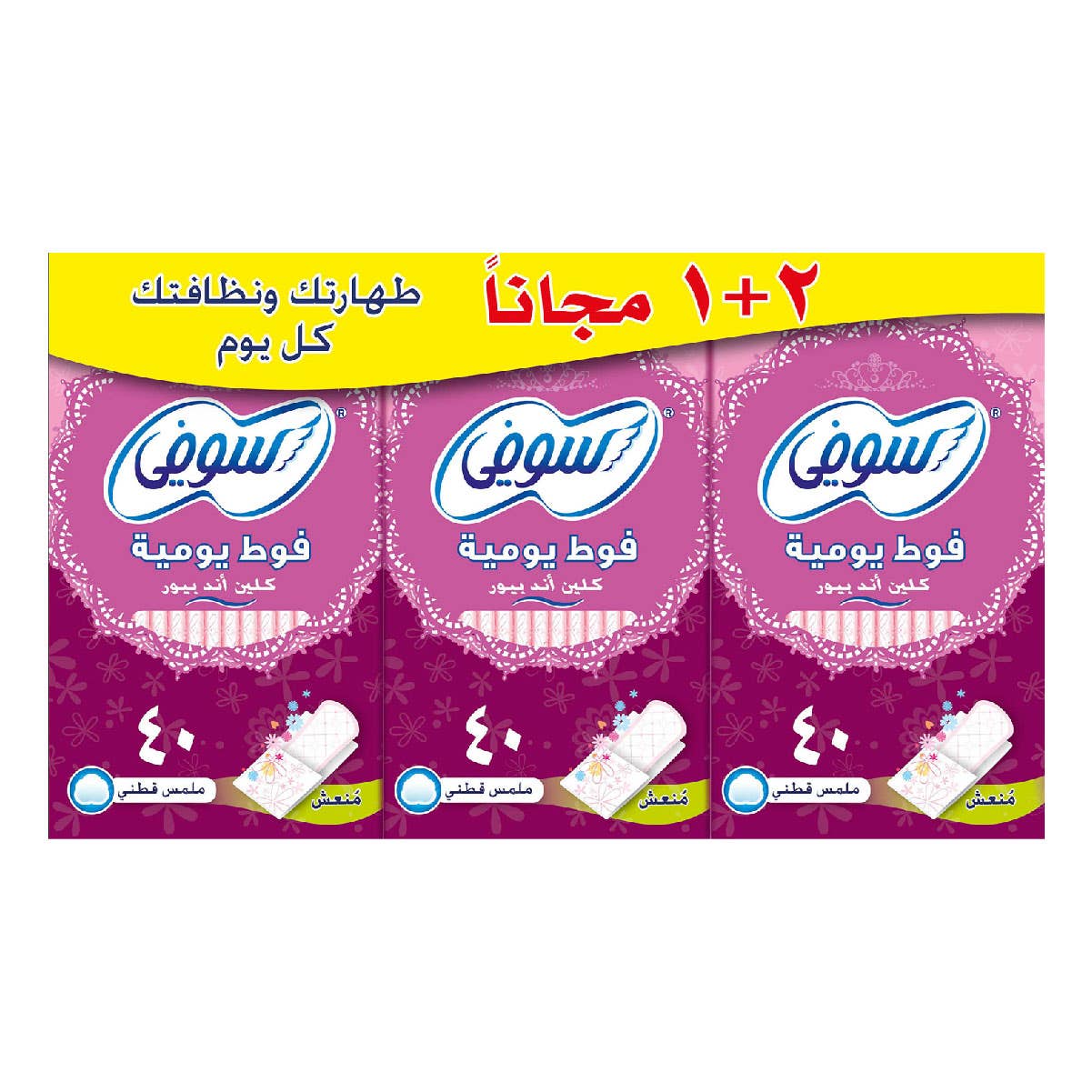سوفي كلين أند بيور فوط يومية منعشة، تتميز بسطح ذات ملمس قطني ناعم على البشره بنظام التغليف الثلاثي فائق النظافة مرنة جدا لتلائم حركة الجسم للاستعمال اليومي، حيث توفر شعورًا بالنظافة والجفاف طوال اليوم. المميزات: تمنحكِ لمسة قطنية ناعمة. فوط سوفي مصنّعة من حشوة فائقة الامتصاص بتقنية يابانية.