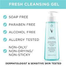 فيشي بوريتيه ثيرمال جل غسول هو جل غني بالرغوة ينظف بشكل فعال جميع الشوائب والماكياج والتلوث من الجلد بينما يقاوم الإحساس المزعج بالماء العسر. منظف الوجه يترك البشرة ناعمة ومنتعشة ، مما يقلل من الإحساس بالضيق.