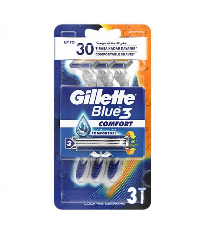 حزمة شفرات حلاقة بلو 3 كومفورت من جيليت 3 قطع : مقبض ناعم للغاية لتحكم جيد\nسهل الحمل ومثالي لبشرتك\nراس محوري بثلاث شفرات