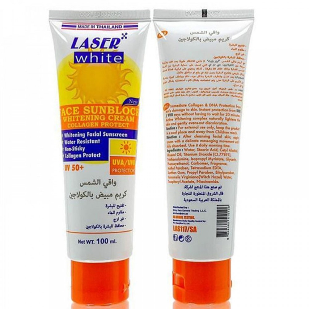 ليزر وايت كريم واقي شمس ومفتح للبشرة بالكولاجين الطبيعي بعامل حماية 50+ هو واقي شمسي قوي لا يحمي بشرتك من الأشعة فوقالبنفسجيةالضارة فحسب ، بل يعمل أيضا على تفتيح لون بشرتك وتوحيد لونها. هذه التركيبة خفيفة الوزن وغير دهنية مثالية لجميع أنواع البشرة ويمكن استخدامها على كل من الوجه والجسم.