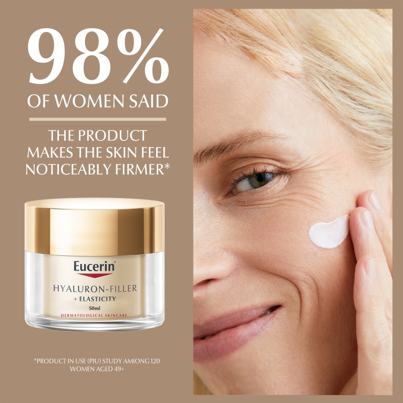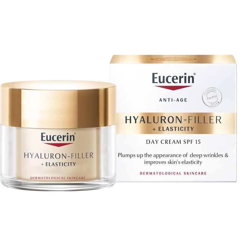 احصلي على مظهر ممتلئ وناعم ومشرق مع كريم النهار Eucerin Hyaluron-Filler + Elasticity Day SPF 15، وهو مرطب مضاد للشيخوخة للبشرة الناضجة، وهو مصمم لملء التجاعيد العميقة وتحسين المرونة.