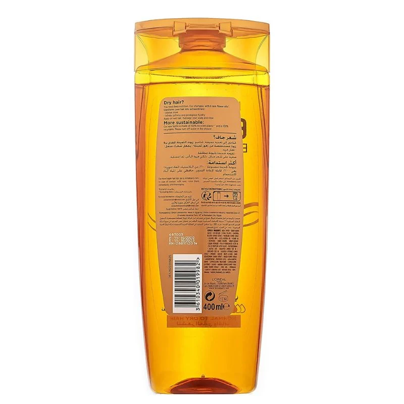 شامبو ايلفيف مغذي بالزيت من لوريال باريس تنظيف وترطيب شامبو فاخر غني بستة مستخلصات أزهار زيتية لتغذية الشعر الجاف من فروة الرأس حتى الأطراف.يمنح الشعر وفروة الرأس التوازن المثالي للشعور بالخفة والترطيب من الجذور حتى الأطراف. هذه التركيبة الشفافة ستجعل شعرك يتغذى بشكل جميل وناعم ومرن.بتركيبة فريدة مغذية.مستخلص 6 زيوت لأزهار نادرة.مخصص للشعر العادي إلى الجاف.يغذي ويرطب الشعر بعمق.ينظف الشعر وينقيه. المكونات:أكوا / ماء، كبريتات لوريث الصوديوم، كوكو بيتين، حمض لوريث 5 الكربوكسيل، كوكاميد ميبا، كلوريد الصوديوم، Ci 19140 / أصفر 5، مستخلص البابونج ريكوتيتا / مستخلص زهرة ماتريكاريا، زيت جوز الهند نوسيفيرا / زيت جوز الهند، بنزوات الصوديوم، هيدروكسيد الصوديوم. ، كوكوات الصوديوم، بولي إيثيلين جلايكول-55 بروبيلين جليكول أوليات، بولي إيثيلين جلايكول-60 زيت الخروع المهدرج، بولي كواترنيوم-10، حمض الساليسيليك، زيت بذور هيليانثوس أنوس / زيت بذور عباد الشمس، الزيلوز، مستخلص نيلومبيوم سبيسيوسوم / مستخلص زهرة نيلومبيوم سبيسيوسوم، مستخلص زهرة لينيوم أوسيتاتيسيموم، إيزوستيريل نيوبنتانوات، أموديميثيكون، بروبيلين جليكول، كابريليك/كابريك ثلاثي الجليسريد، عطر/عطر، كراميل، مستخلص زهرة جاردينيا تاهيتينسيس، مستخلص زهرة روزا كانينا، بيسابولول، كوكوات الميثيل، حمض الستريك، هيكسيلين جليكول، جليكاين زيت الصويا / زيت فول الصويا.