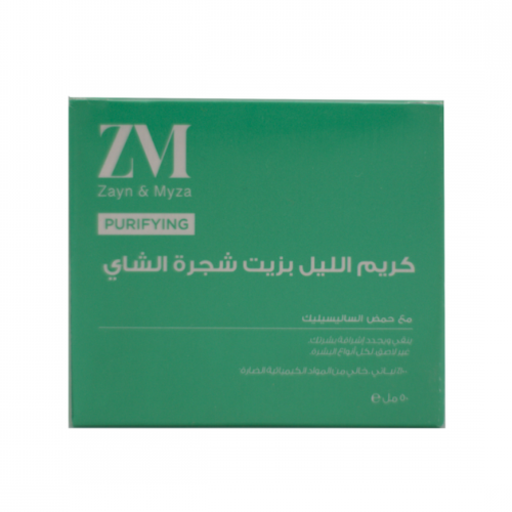 زين اند ميزا (ZM) - كريم الليل بزيت شجر الشاي مع حمض الساليسيليك 50 مل يعالج البشرة ويقلل من حجم المسام ويقوي حاجز البشرة. يمنع نمو البكتيريا ويقلل من الحبوب وينعم البشرة مع التخلص من الاحمرار والحكة.