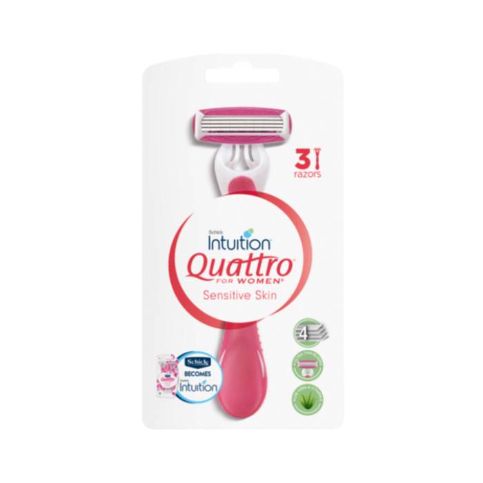 تحتوي شفرات الحلاقة الجديدة شيك انتويشن كواترو التي تستخدم لمرة واحدة على: 4 شفرات متزامنة لحلاقة دقيقة بشكل لا يصدق، وشريط مرطب غني بالصبار وفيتامين E، ورأس محوري مدمج لتتبع منحنيات بشرتك وقبضة مطاطية مريحة مصممة خصيصًا لكيفية حلاقة المرأة. الميزات : 4 شفرات رفيعة للغاية لدقة مذهلة.