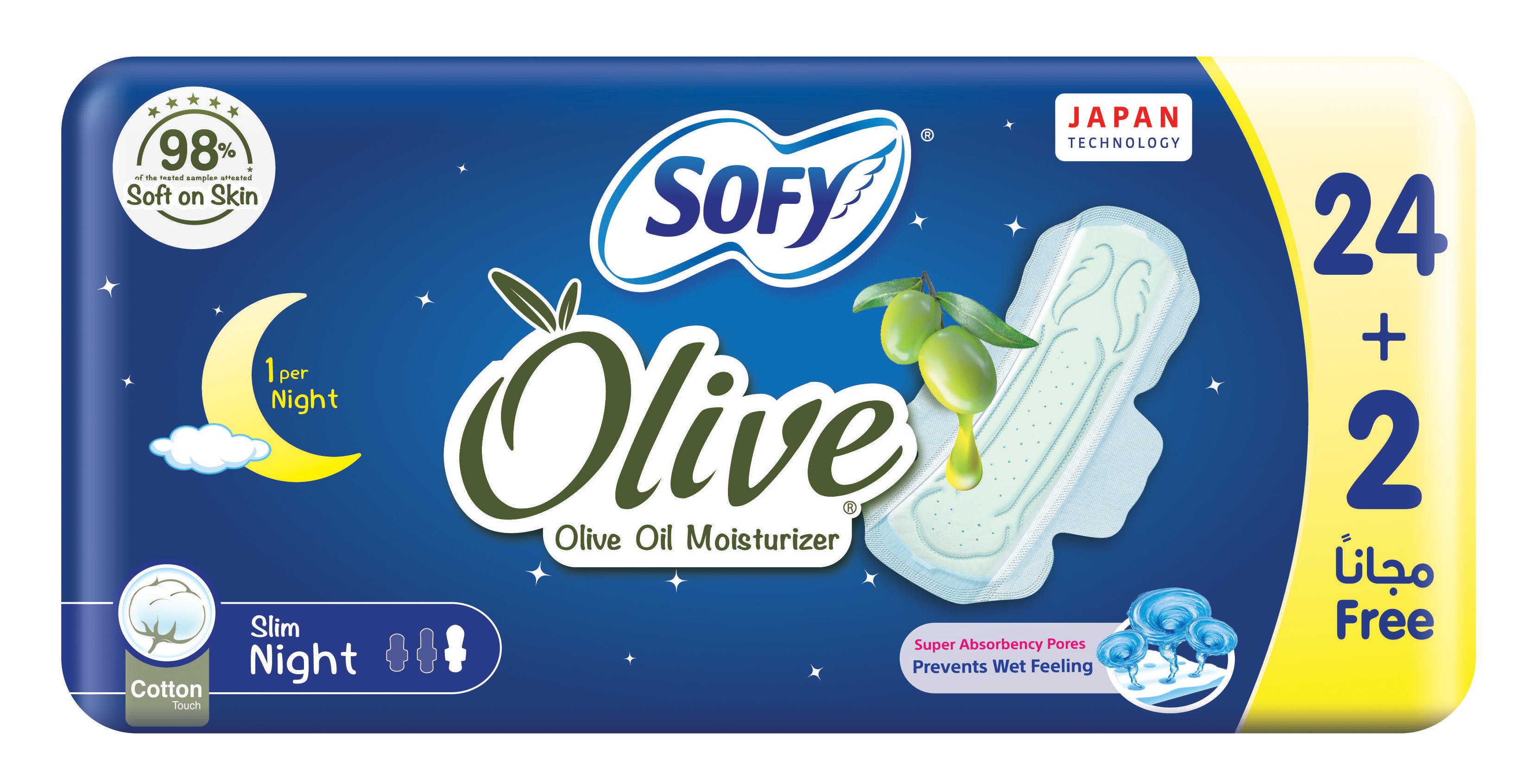 سوفي فوط صحية بزيت الزيتون ليلية بحجم كبير تأتي في عبوة تحتوي على 24 قطعة بالإضافة إلى 2 قطعة إضافية مجاناً. تتميز هذه الفوط بتركيبتها الغنية بزيت الزيتون الذي يساعد على ترطيب البشرة وحمايتها خلال الليل. توفر الفوط حماية فائقة وامتصاصاً ممتازاً بفضل تصميمها الكبير، مما يضمن راحة كاملة وحماية من التسرب طوال الليل.