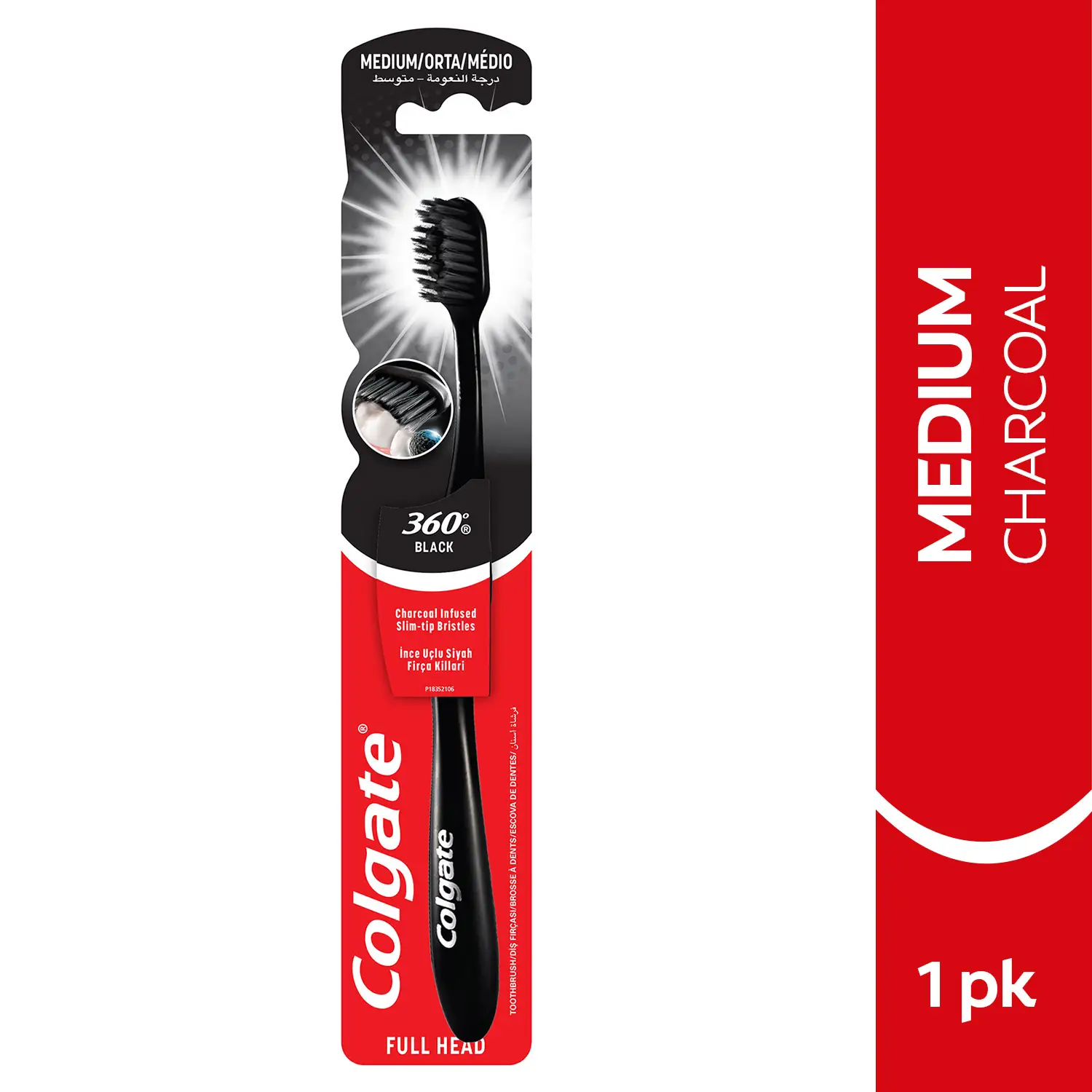 فرشاة أسنان كولجيت 360 الذهبية بالفحم تنظف بفعالية: الأسنان، اللسان، باطن الخدين و اللثة. شعيرات مضادة للجراثيم 100 % تمنع تراكم الجراثيم على فرشاة أسنانك لمدة تصل إلى 90 يوماً. شعيرات حلزونية بالفحم لتنظيف و إزالة بقع سطح الأسنان. مع رؤوس شعيرات أنحف، تصل عميقاً ما بين الأسنان و حول حد اللثة.