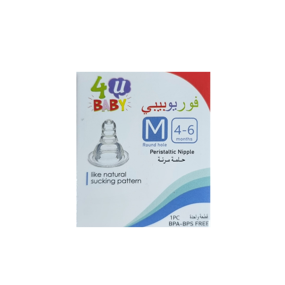 حلمة فور يو بيبي مزودة بصمام يسمح بدخول الهواء إلى الرضاعة بدلاً من دخوله إلى المعدة مما يجعلها مضادة للمغص والإنتفاخات. حلمة فور يو بيبي لينة وقابلة للتمدد وتناسب الرضيع بشكل صحيح أثناء شفط الحليب لذا فهي ملائمة لتجويف فم الرضيع وقريبة جداً لحلمة الأم والرضاعة الطبيعية.
