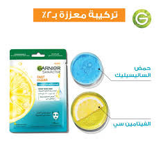 قناع جديد للتنقية السريعة من غارنييه،غني بمزيج من حمض الساليسيليك لتخفيف -48% من الحبوب ظاهريا، و الفيتامين سي^ لتخفيف البقع الداكنة ظاهريا و إشراقة البشرة.