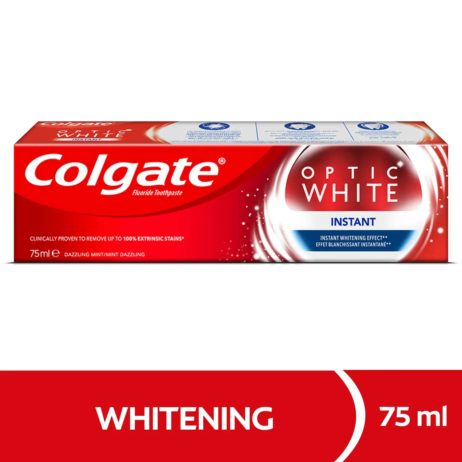 لأسنان أكثر بياضاً فوراً بعد تنظيف الأسنان بمعجون أسنان أوبتيك وايت تبييض فوري. التركيبة تحتوي على عناصر مبيضة أثبت طبياً فعاليتها، لتمنحك إشراقة ملحوظة يتم تنشيطها أثناء تنظيف الأسنان لينتج عنها رغوة زرقاء والتي تمنحك تأثير مؤقت.