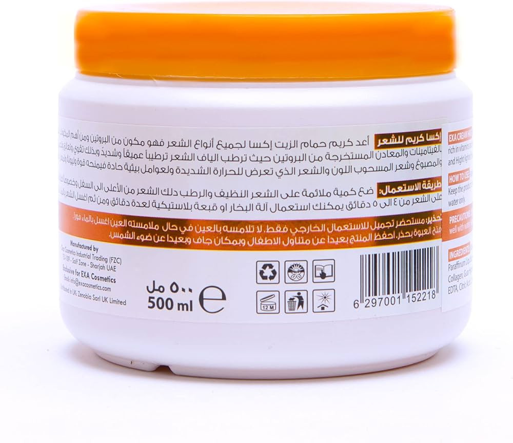 أعد كريم حمام الزيت إكسا لجميع أنواع الشعر فهو مكون من البروتين ومن اهم المكونات الطبيعية غني بالفيتامينات والمعادن المستخرجه من البروتين حيث ترطب الياف الشعر ترطيباً عميقاً وشديداً وبذلك تقوي وتعالج وتحمي الشعر الجاف والمصبوغ والشعر المسحوب اللون والشعر الذي تعرض للحرارة الشديده ولعوامل بيئية حاده فيمنحه قوه وليونه ولمعان طويل الأمد .