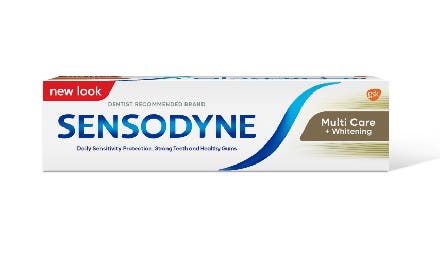 عناية على مدار اليوم وكل يوم للأسنان الحساسة، وهي العالامة التجارية التي ينصح بها أطباء الأسنان. تركيبة خاصة لمن يعانون من حساسية الأسنان، كما يساعد على استعادة البياض الطبيعي للأسنان، فهو يزيل تصبغ الأسنان بفعالية ولطف ويعيد لها البياض الطبيعي، كما يزيل البلاك عند استخدامه بانتظام ويحتوي على الفلورايد الذي يحارب التسوس، كما أن طعم النعناع يمنح الفم شعورًا بالنظافة والانتعاش، سنسوداين تبييض لطيف غير كاشط.ينصح باستخدام معجون الأسنان علي الأقل مرتين يوميًا، ولمدة دقيقتين على الأقل.