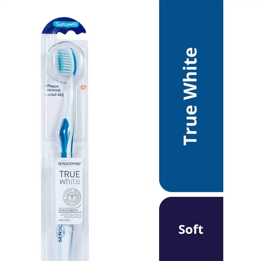 فرشاة أسنان سنسوداين ترو وايت مصممة من قبل الخبراء للأشخاص ذوي الأسنان الحساسة. شعيرات متطورة منظفة تساعد في إزالة البلاك من على الأسنان. الشعيرات الخارجية الناعمة ذات النهايات المتدرجة مصممة خصيصاً لتنظيف حتى المناطق التي يصعب الوصول إليها بلطف.