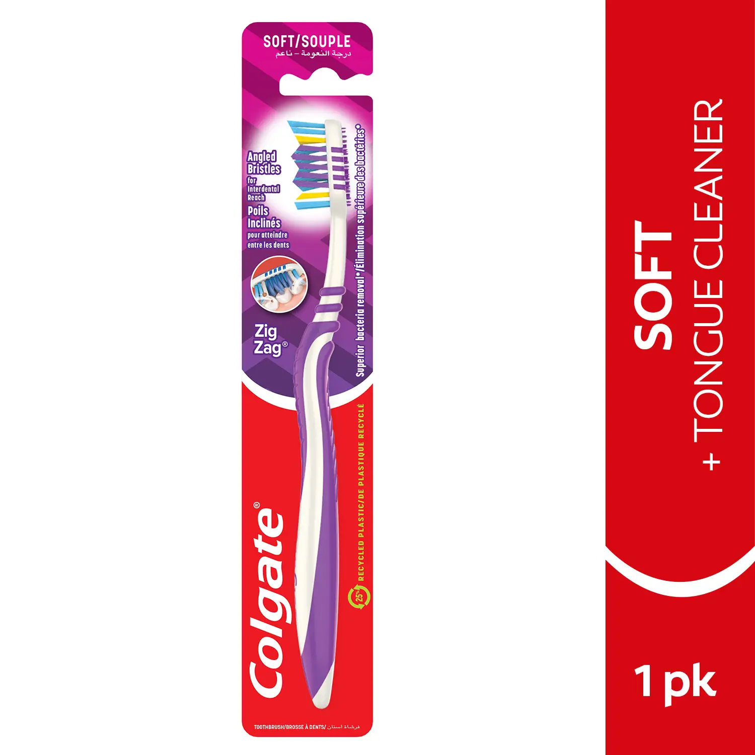 فرشاة أسنان كولجيت زيج زاج فليكسيبل مع منظف اللسان ناعمة لديها شعيرات زيج زاج على شكل V للتنظيف مابين الأسنان وإزالة البلاك المتواجد مابين الأسنان. فرشاة الأسنان لديها رؤوس تنظيف مرتفعة للوصول وإزالة البلاك من الأسنان الخلفية ، حيث التسوس أكثر إنتشاراً. أطباء الأسنان وأخصائيو الصحة ينصحون بإستبدال فرشاة أسنانك كل 3 أشهر.