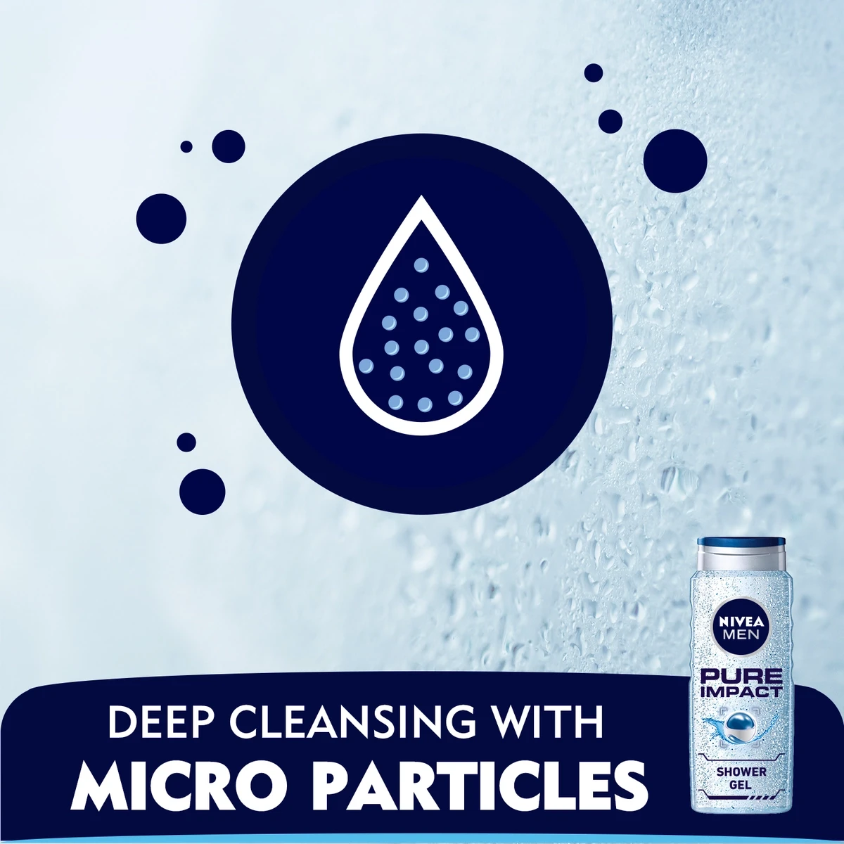 • شاور جل للرجال، بيور إمباكت من نيڤيا، الغني بحبيبيات تقشير شديدة الصغر يعمل على إزالة الشوائب لتنظيف وتنشيط والعناية بالبشرة والشعر.