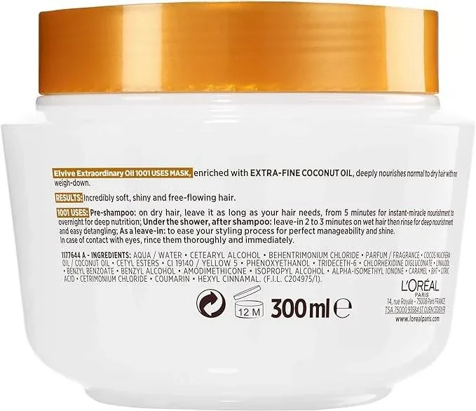 ماسك مغذي بالزيت المغذي من لوريال باريس الفيف 300 مل للشعر الجاف ، بلسم الماسك الأكثر فخامة لدينا. مع 6 مستخلصات من الزهور الزيتية تغذي جميع أنواع الشعر الجاف مما يجعلها تبدو ناعمة ولامعة ونضرة. قومي بتحويل شعرك الجاف. المس نعومة حسية شاهد اللمعان اللامع. رائحة زيوت الزهور الفاخرة.