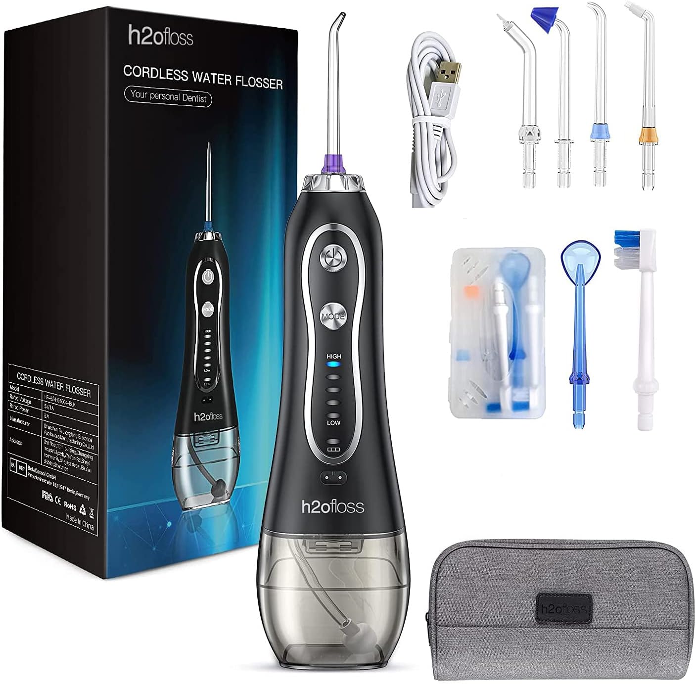 جهاز تنظيف الأسنان بالماء لاسلكي محمول وقابل لإعادة الشحن مع 5 أوضاع و6 رؤوس لتنظيف الأسنان مع خزان مياه سعة 300 مل للمنزل والسفر والعناية بتقويم الأسنان والجسور