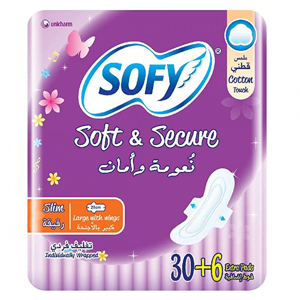 سوفي فوط صحية كبيرة بالاجنحة رقيقة تأتي في عبوة تحتوي على 30 قطعة بالإضافة إلى 6 قطع إضافية مجاناً. تتميز هذه الفوط بتصميمها الرقيق والأجنحة التي تساعد على تثبيتها بشكل آمن، مما يوفر حماية فعالة ضد التسرب. توفر الفوط امتصاصاً ممتازاً مع لمسة ناعمة على البشرة، مما يجعلها مثالية للاستخدام اليومي.